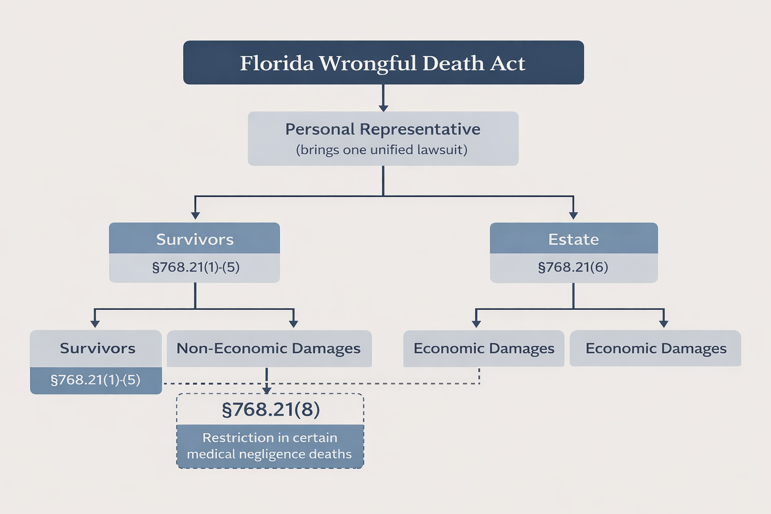 Florida’s Wrongful Death Act governs who may bring a wrongful death claim and what damages may be recovered when a person dies due to the wrongful act or negligence of another. Within that framework, §768.21(8) limits the availability of non-economic damages—commonly understood as damages for mental or emotional pain and suffering and the loss of companionship, instruction, and guidance, for certain survivors in certain circumstances.